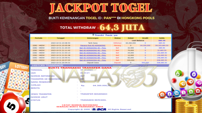 MEMBER NAGA303 MENERIMA PELUNASAN KEMENANGAN JACKPOT TOGEL DI HONGKONG POOLS Rp 64.300.000,- LUNAS