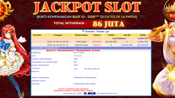 NAGA303 mengucapkan selamat kepada user id : GOS*** yang telah berhasil mendapatkan jackpot pada permainan SLOT DI GATES OF OLYMPUS. Kemenangan sebesar Rp 86.000.000,-. telah dibayarkan LUNAS oleh pihak naga303 kepada pemilik user id setelah yang bersangkutan mengisi formulir withdraw. Proses pencairan dana berlangsung sangat cepat hanya dalam waktu 6-11 menit sudah berada dalam rekening pemilik user id. Bukti transfer yang dapat anda lihat adalah bukti SAH / VALID yang langsung di dapatkan melalui bukti transaksi dari Bank yang digunakan untuk pengiriman dana pada rekening pemilik user id. Terima kasih kami sampaikan kepada para pengguna setia naga303 yang telah menggunakan situs kami, sebagai Bandar Terpercaya yang pastinya membayar semua kemenangan member hingga lunas. Apakah Naga303 PENIPU ? Reputasi “NAGA303 TERPERCAYA” sudah sangat melekat. puluhan hingga ratusan ribu pengguna setia NAGA303 tetap menggunakan situs terbesar dan terbaik di Indonesia ini. Hapus rasa was-was dan khawatir anda, kemenangan anda berapapun PASTI dibayarkan hingga lunas.