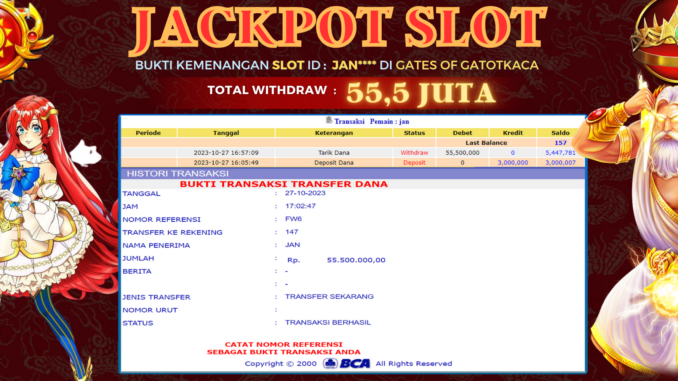 NAGA303 mengucapkan selamat kepada user id : JAN*** yang telah berhasil mendapatkan jackpot pada permainan SLOT DI GATES OF OLYMPUS. Kemenangan sebesar Rp 55.500.000,-. telah dibayarkan LUNAS oleh pihak naga303 kepada pemilik user id setelah yang bersangkutan mengisi formulir withdraw. Proses pencairan dana berlangsung sangat cepat hanya dalam waktu 6-11 menit sudah berada dalam rekening pemilik user id. Bukti transfer yang dapat anda lihat adalah bukti SAH / VALID yang langsung di dapatkan melalui bukti transaksi dari Bank yang digunakan untuk pengiriman dana pada rekening pemilik user id. Terima kasih kami sampaikan kepada para pengguna setia naga303 yang telah menggunakan situs kami, sebagai Bandar Terpercaya yang pastinya membayar semua kemenangan member hingga lunas. Apakah Naga303 PENIPU ? Reputasi “NAGA303 TERPERCAYA” sudah sangat melekat. puluhan hingga ratusan ribu pengguna setia NAGA303 tetap menggunakan situs terbesar dan terbaik di Indonesia ini. Hapus rasa was-was dan khawatir anda, kemenangan anda berapapun PASTI dibayarkan hingga lunas.