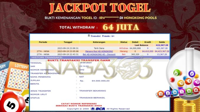 MEMBER NAGA303 MENERIMA PELUNASAN JACKPOT TOGEL di HONGKONG POOLS Rp 64.000.000,- LUNAS