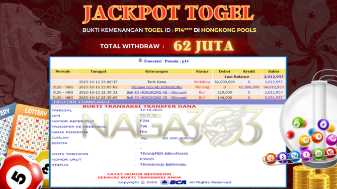 NAGA303 JACKPOT TOGEL DI HONGKONG POOLS Rp 62.000.000,- LUNAS