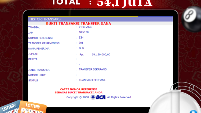 NAGA303 mengucapkan selamat kepada user id : MOR*** yang telah berhasil mendapatkan jackpot pada permainan TOGEL DI 4D MAGNUM. Kemenangan sebesar Rp54.150.000,-. telah dibayarkan LUNAS oleh pihak naga303 kepada pemilik user id setelah yang bersangkutan mengisi formulir withdraw. Proses pencairan dana berlangsung sangat cepat hanya dalam waktu 6-11 menit sudah berada dalam rekening pemilik user id. Bukti transfer yang dapat anda lihat adalah bukti SAH / VALID yang langsung di dapatkan melalui bukti transaksi dari Bank yang digunakan untuk pengiriman dana pada rekening pemilik user id. Terima kasih kami sampaikan kepada para pengguna setia naga303 yang telah menggunakan situs kami, sebagai Bandar Terpercaya yang pastinya membayar semua kemenangan member hingga lunas. Apakah Naga303 PENIPU ? Reputasi “NAGA303 TERPERCAYA” sudah sangat melekat. puluhan hingga ratusan ribu pengguna setia NAGA303 tetap menggunakan situs terbesar dan terbaik di Indonesia ini. Hapus rasa was-was dan khawatir anda, kemenangan anda berapapun PASTI dibayarkan hingga lunas.