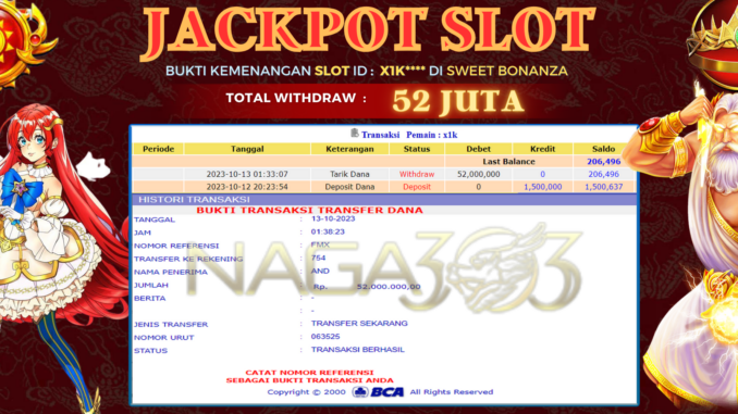 NAGA303 mengucapkan selamat kepada user id : X1K*** yang telah berhasil mendapatkan jackpot pada permainanan SLOT DI SWEET BONANZA. Kemenangan sebesar Rp 52.000.000,-. telah dibayarkan LUNAS oleh pihak naga303 kepada pemilik user id setelah yang bersangkutan mengisi formulir withdraw. Proses pencairan dana berlangsung sangat cepat hanya dalam waktu 6-11 menit sudah berada dalam rekening pemilik user id. Bukti transfer yang dapat anda lihat adalah bukti SAH / VALID yang langsung di dapatkan melalui bukti transaksi dari Bank yang digunakan untuk pengiriman dana pada rekening pemilik user id. Terima kasih kami sampaikan kepada para pengguna setia naga303 yang telah menggunakan situs kami, sebagai Bandar Terpercaya yang pastinya membayar semua kemenangan member hingga lunas. Apakah Naga303 PENIPU ? Reputasi “NAGA303 TERPERCAYA” sudah sangat melekat. puluhan hingga ratusan ribu pengguna setia NAGA303 tetap menggunakan situs terbesar dan terbaik di Indonesia ini. Hapus rasa was-was dan khawatir anda, kemenangan anda berapapun PASTI dibayarkan hingga lunas.