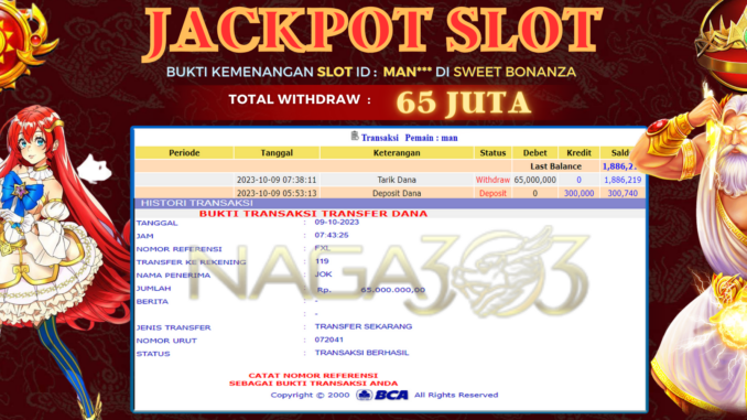 NAGA303 mengucapkan selamat kepada user id : MAN*** yang telah berhasil mendapatkan jackpot pada permainanan SLOT DI SWEET BONANZA. Kemenangan sebesar Rp 65.000.000,-. telah dibayarkan LUNAS oleh pihak naga303 kepada pemilik user id setelah yang bersangkutan mengisi formulir withdraw. Proses pencairan dana berlangsung sangat cepat hanya dalam waktu 6-11 menit sudah berada dalam rekening pemilik user id. Bukti transfer yang dapat anda lihat adalah bukti SAH / VALID yang langsung di dapatkan melalui bukti transaksi dari Bank yang digunakan untuk pengiriman dana pada rekening pemilik user id. Terima kasih kami sampaikan kepada para pengguna setia naga303 yang telah menggunakan situs kami, sebagai Bandar Terpercaya yang pastinya membayar semua kemenangan member hingga lunas. Apakah Naga303 PENIPU ? Reputasi “NAGA303 TERPERCAYA” sudah sangat melekat. puluhan hingga ratusan ribu pengguna setia NAGA303 tetap menggunakan situs terbesar dan terbaik di Indonesia ini. Hapus rasa was-was dan khawatir anda, kemenangan anda berapapun PASTI dibayarkan hingga lunas.