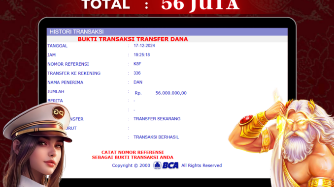NAGA303 mengucapkan selamat kepada user id : DAN*** yang telah berhasil mendapatkan jackpot pada permainanan SLOT DI SPACEMAN. Kemenangan sebesar RP 56.000.000,- telah dibayarkan LUNAS oleh pihak naga303 kepada pemilik user id setelah yang bersangkutan mengisi formulir withdraw. Proses pencairan dana berlangsung sangat cepat hanya dalam waktu 6-11 menit sudah berada dalam rekening pemilik user id. Bukti transfer yang dapat anda lihat adalah bukti SAH / VALID yang langsung di dapatkan melalui bukti transaksi dari Bank yang digunakan untuk pengiriman dana pada rekening pemilik user id. Terima kasih kami sampaikan kepada para pengguna setia naga303 yang telah menggunakan situs kami, sebagai Bandar Terpercaya yang pastinya membayar semua kemenangan member hingga lunas. Apakah Naga303 PENIPU ? Reputasi “NAGA303 TERPERCAYA” sudah sangat melekat. puluhan hingga ratusan ribu pengguna setia NAGA303 tetap menggunakan situs terbesar dan terbaik di Indonesia ini. Hapus rasa was-was dan khawatir anda, kemenangan anda berapapun PASTI dibayarkan hingga lunas.