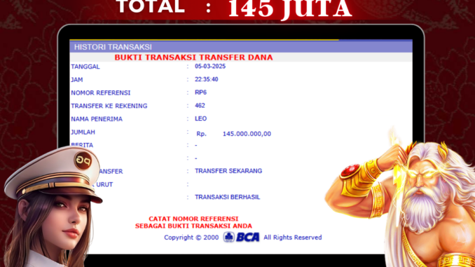 NAGA303 mengucapkan selamat kepada user id : LEN*** yang telah berhasil mendapatkan jackpot pada permainanan SLOT DI QUEEN OF BOUNTY. Kemenangan sebesar Rp 145.000.000,-. telah dibayarkan LUNAS oleh pihak naga303 kepada pemilik user id setelah yang bersangkutan mengisi formulir withdraw. Proses pencairan dana berlangsung sangat cepat hanya dalam waktu 6-11 menit sudah berada dalam rekening pemilik user id. Bukti transfer yang dapat anda lihat adalah bukti SAH / VALID yang langsung di dapatkan melalui bukti transaksi dari Bank yang digunakan untuk pengiriman dana pada rekening pemilik user id. Terima kasih kami sampaikan kepada para pengguna setia naga303 yang telah menggunakan situs kami, sebagai Bandar Terpercaya yang pastinya membayar semua kemenangan member hingga lunas. Apakah Naga303 PENIPU ? Reputasi “NAGA303 TERPERCAYA” sudah sangat melekat. puluhan hingga ratusan ribu pengguna setia NAGA303 tetap menggunakan situs terbesar dan terbaik di Indonesia ini. Hapus rasa was-was dan khawatir anda, kemenangan anda berapapun PASTI dibayarkan hingga lunas.