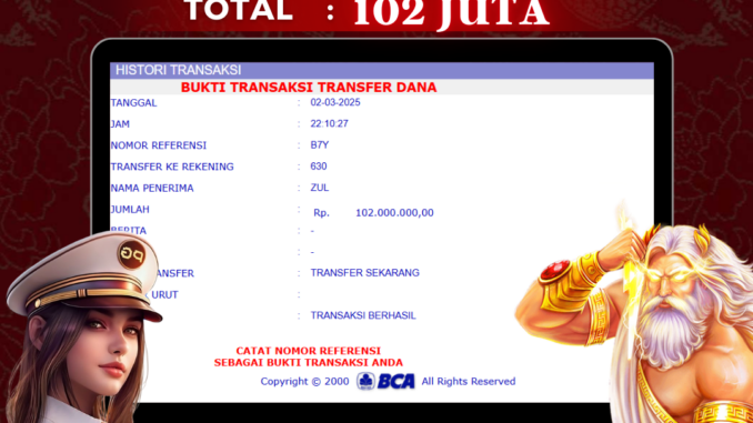 NAGA303 mengucapkan selamat kepada user id : ZUL*** yang telah berhasil mendapatkan jackpot pada permainanan SLOT DI GATES OF OLYMPUS 1000. Kemenangan sebesar Rp 102.000.000,-. telah dibayarkan LUNAS oleh pihak naga303 kepada pemilik user id setelah yang bersangkutan mengisi formulir withdraw. Proses pencairan dana berlangsung sangat cepat hanya dalam waktu 6-11 menit sudah berada dalam rekening pemilik user id. Bukti transfer yang dapat anda lihat adalah bukti SAH / VALID yang langsung di dapatkan melalui bukti transaksi dari Bank yang digunakan untuk pengiriman dana pada rekening pemilik user id. Terima kasih kami sampaikan kepada para pengguna setia naga303 yang telah menggunakan situs kami, sebagai Bandar Terpercaya yang pastinya membayar semua kemenangan member hingga lunas. Apakah Naga303 PENIPU ? Reputasi “NAGA303 TERPERCAYA” sudah sangat melekat. puluhan hingga ratusan ribu pengguna setia NAGA303 tetap menggunakan situs terbesar dan terbaik di Indonesia ini. Hapus rasa was-was dan khawatir anda, kemenangan anda berapapun PASTI dibayarkan hingga lunas.