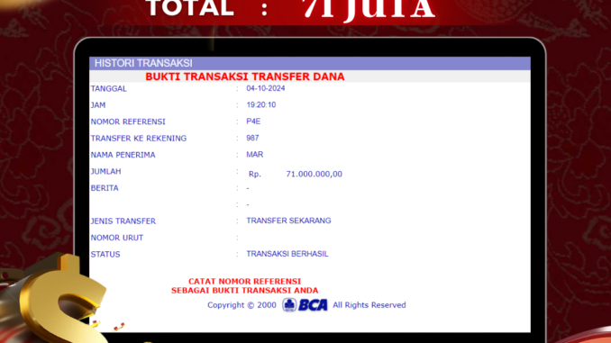 NAGA303 mengucapkan selamat kepada user id : LOB*** yang telah berhasil mendapatkan jackpot pada permainanan LIVE CASINO DI ROULETTE. Kemenangan sebesar Rp 71.000.000,-. telah dibayarkan LUNAS oleh pihak naga303 kepada pemilik user id setelah yang bersangkutan mengisi formulir withdraw. Proses pencairan dana berlangsung sangat cepat hanya dalam waktu 6-11 menit sudah berada dalam rekening pemilik user id. Bukti transfer yang dapat anda lihat adalah bukti SAH / VALID yang langsung di dapatkan melalui bukti transaksi dari Bank yang digunakan untuk pengiriman dana pada rekening pemilik user id. Terima kasih kami sampaikan kepada para pengguna setia naga303 yang telah menggunakan situs kami, sebagai Bandar Terpercaya yang pastinya membayar semua kemenangan member hingga lunas. Apakah Naga303 PENIPU ? Reputasi “NAGA303 TERPERCAYA” sudah sangat melekat. puluhan hingga ratusan ribu pengguna setia NAGA303 tetap menggunakan situs terbesar dan terbaik di Indonesia ini. Hapus rasa was-was dan khawatir anda, kemenangan anda berapapun PASTI dibayarkan hingga lunas.