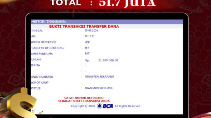NAGA303 mengucapkan selamat kepada user id : GER*** yang telah berhasil mendapatkan jackpot pada permainanan LIVE CASINO di BACCARAT . Kemenangan sebesar Rp 51.700.000,-. telah dibayarkan LUNAS oleh pihak naga303 kepada pemilik user id setelah yang bersangkutan mengisi formulir withdraw. Proses pencairan dana berlangsung sangat cepat hanya dalam waktu 6-11 menit sudah berada dalam rekening pemilik user id. Bukti transfer yang dapat anda lihat adalah bukti SAH / VALID yang langsung di dapatkan melalui bukti transaksi dari Bank yang digunakan untuk pengiriman dana pada rekening pemilik user id. Terima kasih kami sampaikan kepada para pengguna setia naga303 yang telah menggunakan situs kami, sebagai Bandar Terpercaya yang pastinya membayar semua kemenangan member hingga lunas. Apakah Naga303 PENIPU ? Reputasi “NAGA303 TERPERCAYA” sudah sangat melekat. puluhan hingga ratusan ribu pengguna setia NAGA303 tetap menggunakan situs terbesar dan terbaik di Indonesia ini. Hapus rasa was-was dan khawatir anda, kemenangan anda berapapun PASTI dibayarkan hingga lunas.