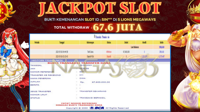 NAGA303 JACKPOT SLOT di 5 LIONS MEGAWAYS RP 67.600.000,- LUNAS