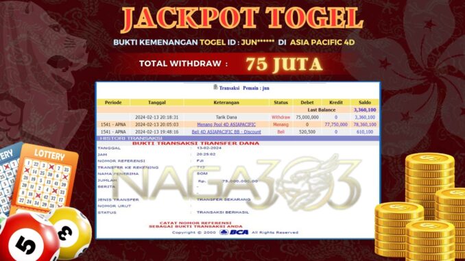 MEMBER NAGA303 MENERIMA PELUNASAN KEMENANGAN JACKPOT TOGEL ASIA PACIFIC 4D RP 75.000.000,- LUNAS