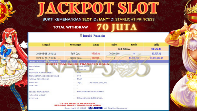 NAGA303 mengucapkan selamat kepada user id : IAN*** yang telah berhasil mendapatkan jackpot pada permainan SLOT di STARLIGHT PRINCESS . Kemenangan sebesar Rp 70.000.000,-. telah dibayarkan LUNAS oleh pihak naga303 kepada pemilik user id setelah yang bersangkutan mengisi formulir withdraw. Proses pencairan dana berlangsung sangat cepat hanya dalam waktu 6-11 menit sudah berada dalam rekening pemilik user id. Bukti transfer yang dapat anda lihat adalah bukti SAH / VALID yang langsung di dapatkan melalui bukti transaksi dari Bank yang digunakan untuk pengiriman dana pada rekening pemilik user id. Terima kasih kami sampaikan kepada para pengguna setia naga303 yang telah menggunakan situs kami, sebagai Bandar Terpercaya yang pastinya membayar semua kemenangan member hingga lunas. Apakah Naga303 PENIPU ? Reputasi “NAGA303 TERPERCAYA” sudah sangat melekat. puluhan hingga ratusan ribu pengguna setia NAGA303 tetap menggunakan situs terbesar dan terbaik di Indonesia ini. Hapus rasa was-was dan khawatir anda, kemenangan anda berapapun PASTI dibayarkan hingga lunas.