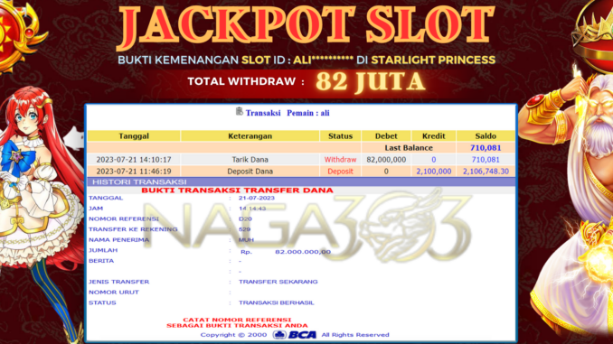 MEMBER NAGA303 MENERIMA PELUNASAN KEMENANGAN JACKPOT SLOT di STARLIGHT PRINCESS Rp 82.000.000,- LUNAS