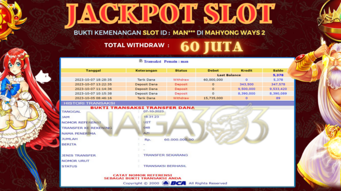 MEMBER NAGA303 MENERIMA PELUNASAN KEMENANGAN JACKPOT SLOT DI MAHYONG WAYS 2 Rp 60.000.000,- LUNAS