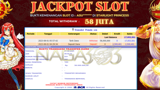 NAGA303 mengucapkan selamat kepada user id : ASU*** yang telah berhasil mendapatkan jackpot pada permainan SLOT di STARLIGHT PRINCESS. Kemenangan sebesar Rp 58.000.000,-. telah dibayarkan LUNAS oleh pihak naga303 kepada pemilik user id setelah yang bersangkutan mengisi formulir withdraw. Proses pencairan dana berlangsung sangat cepat hanya dalam waktu 6-11 menit sudah berada dalam rekening pemilik user id. Bukti transfer yang dapat anda lihat adalah bukti SAH / VALID yang langsung di dapatkan melalui bukti transaksi dari Bank yang digunakan untuk pengiriman dana pada rekening pemilik user id. Terima kasih kami sampaikan kepada para pengguna setia naga303 yang telah menggunakan situs kami, sebagai Bandar Terpercaya yang pastinya membayar semua kemenangan member hingga lunas. Apakah Naga303 PENIPU ? Reputasi “NAGA303 TERPERCAYA” sudah sangat melekat. puluhan hingga ratusan ribu pengguna setia NAGA303 tetap menggunakan situs terbesar dan terbaik di Indonesia ini. Hapus rasa was-was dan khawatir anda, kemenangan anda berapapun PASTI dibayarkan hingga lunas.