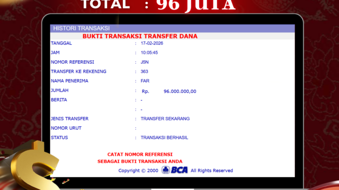 NAGA303 mengucapkan selamat kepada user id : FAR*** yang telah berhasil mendapatkan jackpot pada permainan LIVE CASINO DI EUROPE BACCARAT. Kemenangan sebesar Rp 96.000.000,-. telah dibayarkan LUNAS oleh pihak naga303 kepada pemilik user id setelah yang bersangkutan mengisi formulir withdraw. Proses pencairan dana berlangsung sangat cepat hanya dalam waktu 6-11 menit sudah berada dalam rekening pemilik user id. Bukti transfer yang dapat anda lihat adalah bukti SAH / VALID yang langsung di dapatkan melalui bukti transaksi dari Bank yang digunakan untuk pengiriman dana pada rekening pemilik user id. Terima kasih kami sampaikan kepada para pengguna setia naga303 yang telah menggunakan situs kami, sebagai Bandar Terpercaya yang pastinya membayar semua kemenangan member hingga lunas. Apakah Naga303 PENIPU ? Reputasi “NAGA303 TERPERCAYA” sudah sangat melekat. puluhan hingga ratusan ribu pengguna setia NAGA303 tetap menggunakan situs terbesar dan terbaik di Indonesia ini. Hapus rasa was-was dan khawatir anda, kemenangan anda berapapun PASTI dibayarkan hingga lunas.