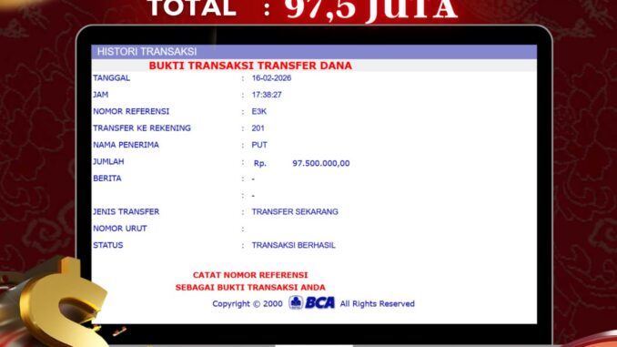 NAGA303 mengucapkan selamat kepada user id : PUT*** yang telah berhasil mendapatkan jackpot pada permainan LIVE CASINO DI RACE BALL. Kemenangan sebesar Rp 97.500.000,-. telah dibayarkan LUNAS oleh pihak naga303 kepada pemilik user id setelah yang bersangkutan mengisi formulir withdraw. Proses pencairan dana berlangsung sangat cepat hanya dalam waktu 6-11 menit sudah berada dalam rekening pemilik user id. Bukti transfer yang dapat anda lihat adalah bukti SAH / VALID yang langsung di dapatkan melalui bukti transaksi dari Bank yang digunakan untuk pengiriman dana pada rekening pemilik user id. Terima kasih kami sampaikan kepada para pengguna setia naga303 yang telah menggunakan situs kami, sebagai Bandar Terpercaya yang pastinya membayar semua kemenangan member hingga lunas. Apakah Naga303 PENIPU ? Reputasi “NAGA303 TERPERCAYA” sudah sangat melekat. puluhan hingga ratusan ribu pengguna setia NAGA303 tetap menggunakan situs terbesar dan terbaik di Indonesia ini. Hapus rasa was-was dan khawatir anda, kemenangan anda berapapun PASTI dibayarkan hingga lunas.