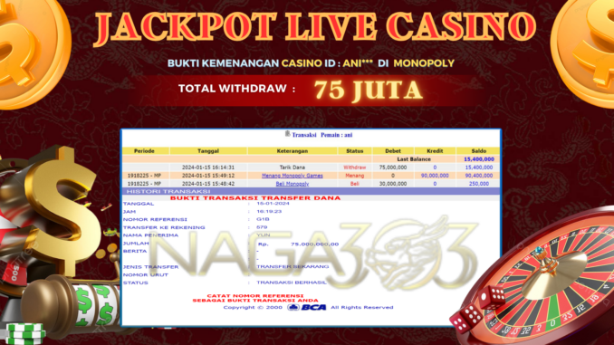 NAGA303 mengucapkan selamat kepada user id : ANI*** yang telah berhasil mendapatkan jackpot pada permainan LIVE CASINO DI MONOPOLY GAMES. Kemenangan sebesar Rp 75.000.000,-. telah dibayarkan LUNAS oleh pihak naga303 kepada pemilik user id setelah yang bersangkutan mengisi formulir withdraw. Proses pencairan dana berlangsung sangat cepat hanya dalam waktu 6-11 menit sudah berada dalam rekening pemilik user id. Bukti transfer yang dapat anda lihat adalah bukti SAH / VALID yang langsung di dapatkan melalui bukti transaksi dari Bank yang digunakan untuk pengiriman dana pada rekening pemilik user id. Terima kasih kami sampaikan kepada para pengguna setia naga303 yang telah menggunakan situs kami, sebagai Bandar Terpercaya yang pastinya membayar semua kemenangan member hingga lunas. Apakah Naga303 PENIPU ? Reputasi “NAGA303 TERPERCAYA” sudah sangat melekat. puluhan hingga ratusan ribu pengguna setia NAGA303 tetap menggunakan situs terbesar dan terbaik di Indonesia ini. Hapus rasa was-was dan khawatir anda, kemenangan anda berapapun PASTI dibayarkan hingga lunas.