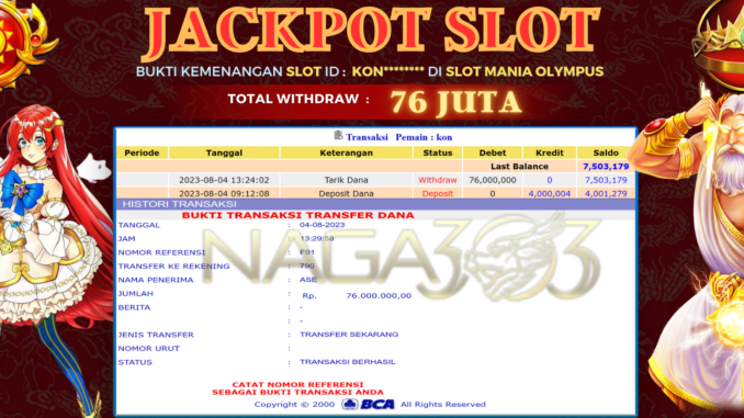 NAGA303 mengucapkan selamat kepada user id : KON*** yang telah berhasil mendapatkan jackpot pada permainan SLOT di SLOT MANIA OLYMPUS. Kemenangan sebesar Rp 76.000.000,-. telah dibayarkan LUNAS oleh pihak naga303 kepada pemilik user id setelah yang bersangkutan mengisi formulir withdraw. Proses pencairan dana berlangsung sangat cepat hanya dalam waktu 6-11 menit sudah berada dalam rekening pemilik user id. Bukti transfer yang dapat anda lihat adalah bukti SAH / VALID yang langsung di dapatkan melalui bukti transaksi dari Bank yang digunakan untuk pengiriman dana pada rekening pemilik user id. Terima kasih kami sampaikan kepada para pengguna setia naga303 yang telah menggunakan situs kami, sebagai Bandar Terpercaya yang pastinya membayar semua kemenangan member hingga lunas. Apakah Naga303 PENIPU ? Reputasi “NAGA303 TERPERCAYA” sudah sangat melekat. puluhan hingga ratusan ribu pengguna setia NAGA303 tetap menggunakan situs terbesar dan terbaik di Indonesia ini. Hapus rasa was-was dan khawatir anda, kemenangan anda berapapun PASTI dibayarkan hingga lunas.