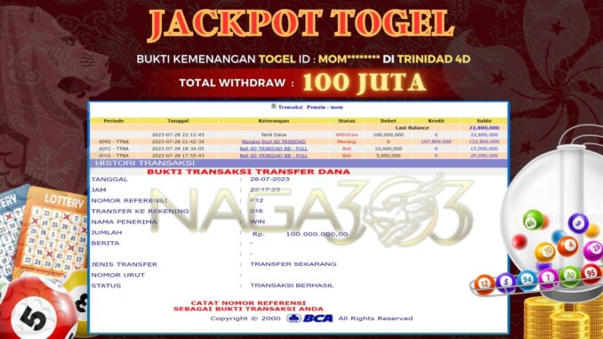 NAGA303 JACKPOT TOGEL DI TRINIDAD 4D Rp 100.000.000,- LUNAS