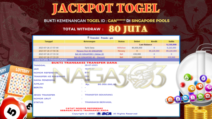 MEMBER NAGA303 MENERIMA PELUNASAN KEMENANGAN JACKPOT TOGEL DI SINGAPORE POOLS Rp 80.000.000,- LUNAS