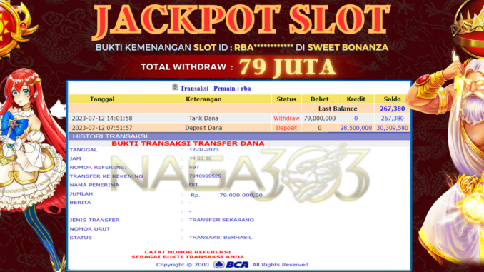 NAGA303 mengucapkan selamat kepada user id : RBA*** yang telah berhasil mendapatkan jackpot pada permainan SLOT DI SWEET BONANZA. Kemenangan sebesar Rp 79.000.000,-. telah dibayarkan LUNAS oleh pihak naga303 kepada pemilik user id setelah yang bersangkutan mengisi formulir withdraw. Proses pencairan dana berlangsung sangat cepat hanya dalam waktu 6-11 menit sudah berada dalam rekening pemilik user id. Bukti transfer yang dapat anda lihat adalah bukti SAH / VALID yang langsung di dapatkan melalui bukti transaksi dari Bank yang digunakan untuk pengiriman dana pada rekening pemilik user id. Terima kasih kami sampaikan kepada para pengguna setia naga303 yang telah menggunakan situs kami, sebagai Bandar Terpercaya yang pastinya membayar semua kemenangan member hingga lunas. Apakah Naga303 PENIPU ? Reputasi “NAGA303 TERPERCAYA” sudah sangat melekat. puluhan hingga ratusan ribu pengguna setia NAGA303 tetap menggunakan situs terbesar dan terbaik di Indonesia ini. Hapus rasa was-was dan khawatir anda, kemenangan anda berapapun PASTI dibayarkan hingga lunas.