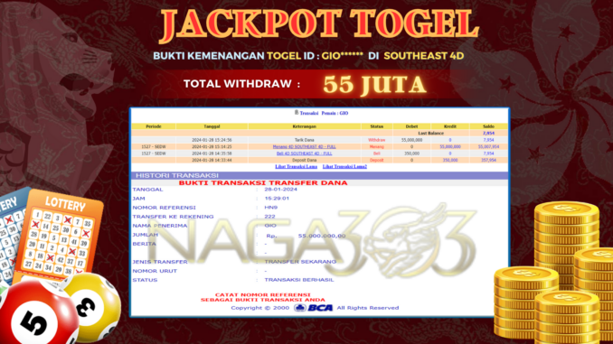 NAGA303 JACKPOT TOGEL SOUTHEAST 4D Rp 55.000.000,- LUNAS